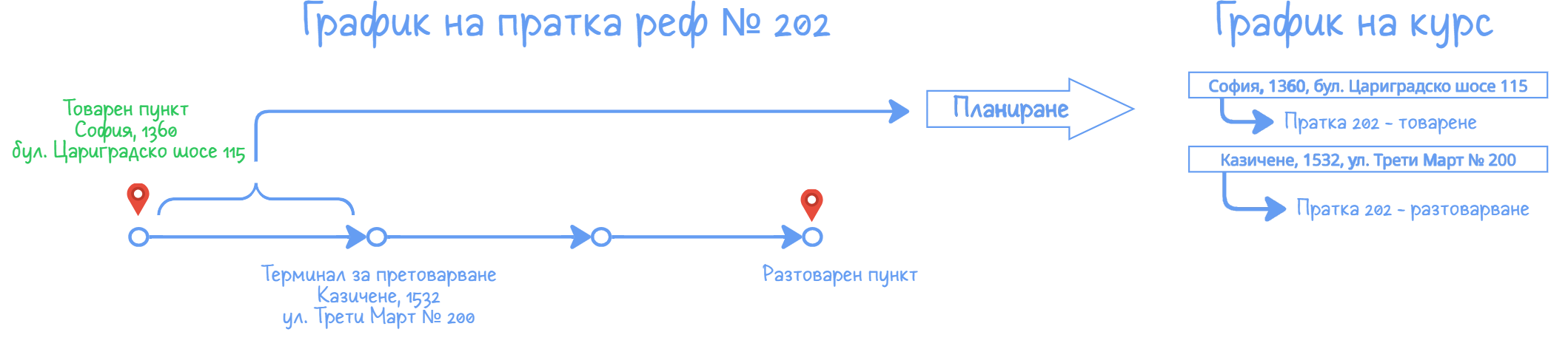 - Елемента от графика на пратката да е правилно попълнен - елемента представлява отсечка от маршрута на пратката. В двата и края има адреси или терминали. Те трябва да са описани така, че да отговарят на следните условия: