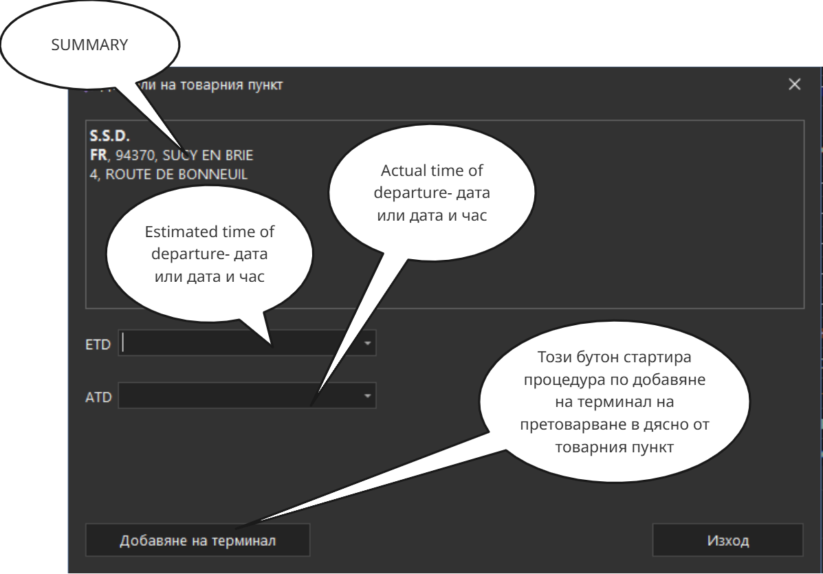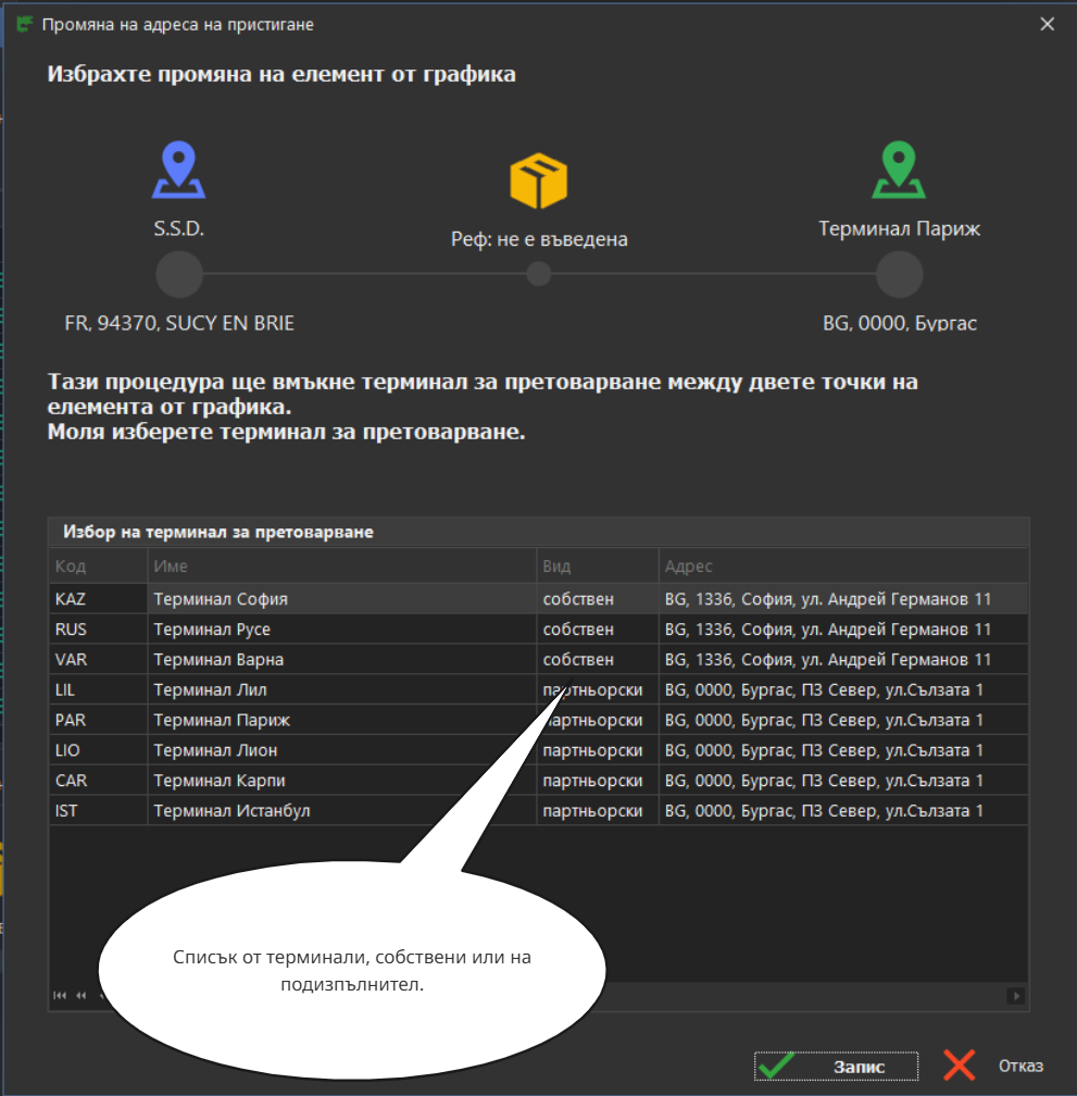 Добавяне на терминал е един от начините за ръчно модифициране на графика. Чрез това действие се добавя точка за претоварване между точката от която се стартира действието (в случая това е товарния пункт) и следващата точка от маршрута на пратката.
