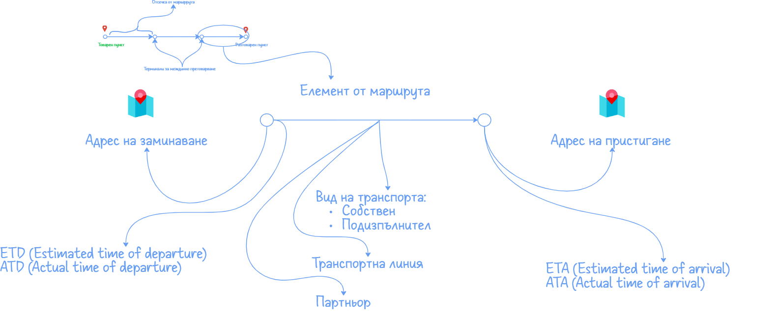 - ETA (Estimated Time of Arrival) - очаквано време за пристигане на адрес или терминал. Може да бъде дата, дата и час или интервал от дати (дати и часове).